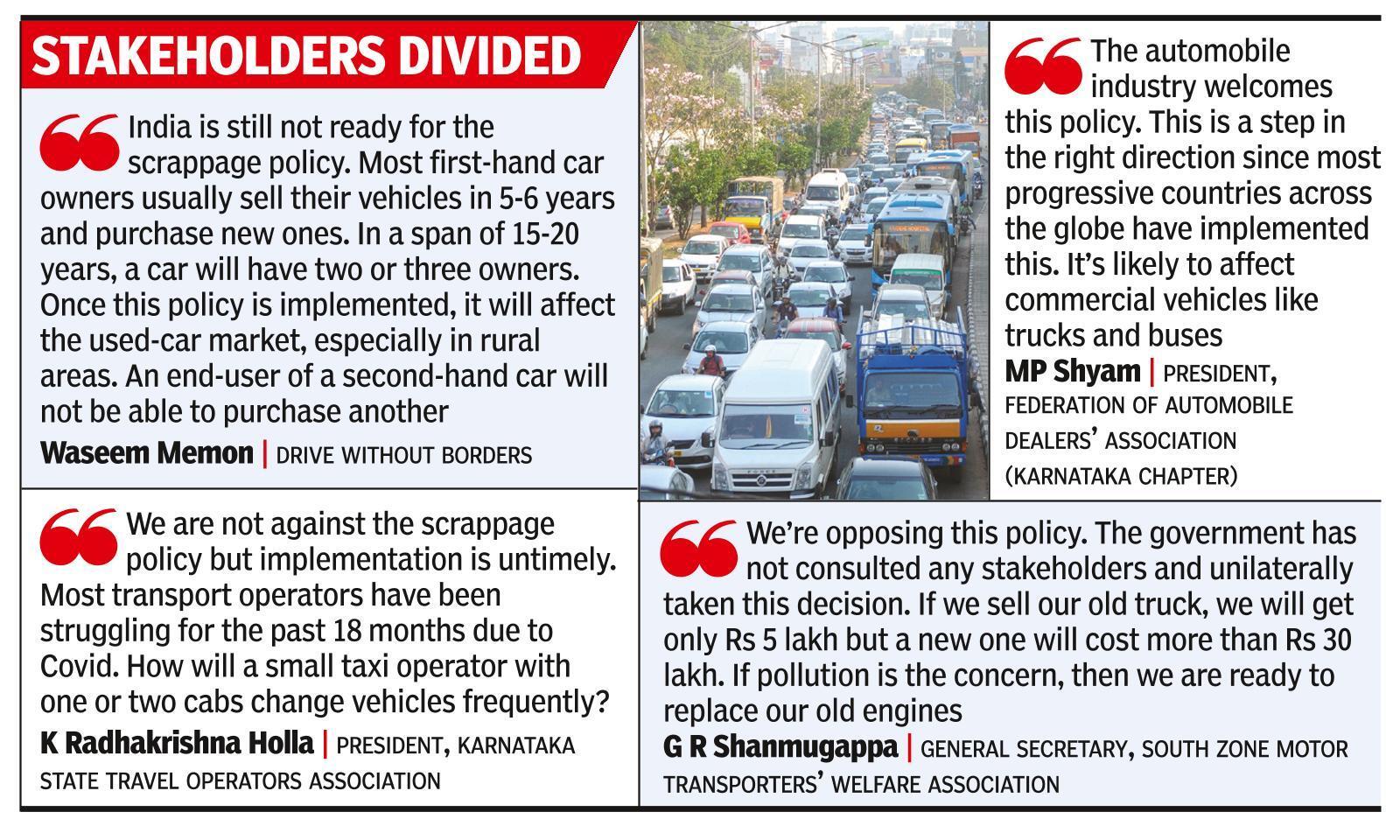 BENGALURU: The vehicle-scrappage policy launched by Prime Minister Narendra Modi on Friday is likely to affect more than 40 lakh vehicles in Karnataka.