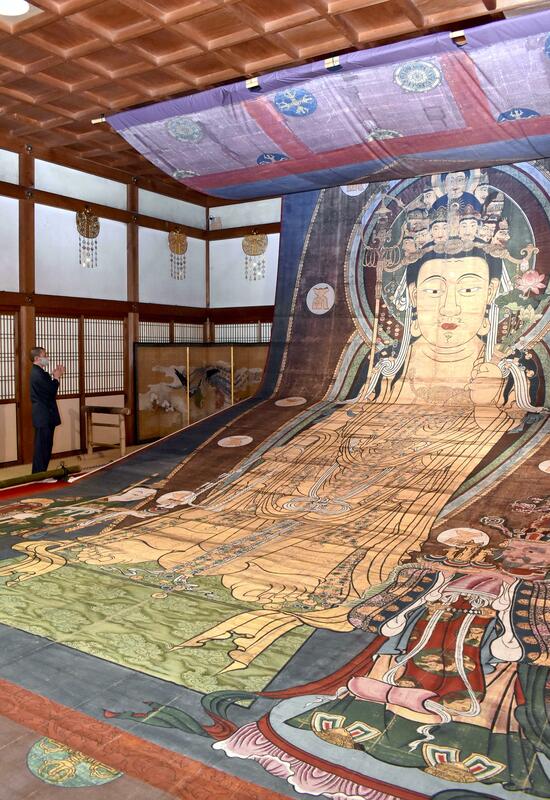 SAKURAI, Nara – A replica of one of the nation's largest hanging scrolls, depicting the statue of the eleven-faced kannon enshrined at Hasedera temple in Sakurai, Nara Prefecture, is being displayed for the first time at the temple's main hall. Hasedera temple is the headquarters of the Shingonshu sect's Buzan division.