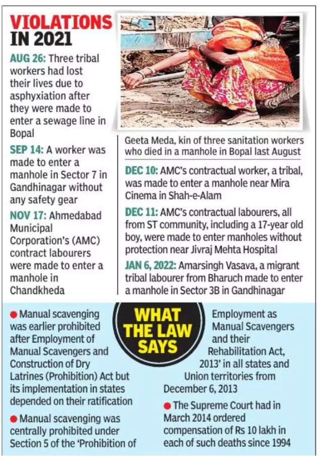 AHMEDABAD: On January 6, Amarsingh Vasava, a migrant labourer from Bharuch, was made to enter a manhole to clean the drainage line in Sector 3B of Gandhinagar. Vasava is a member of the Scheduled Tribes (ST) community.