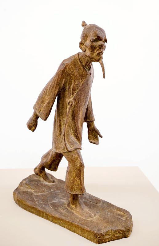 A wood carving he did early on, "Shoka Kimigayo," shows a very detailed image of a boy singing. Even the texture of the boy's clothes and hat seem to be expressed in the work.