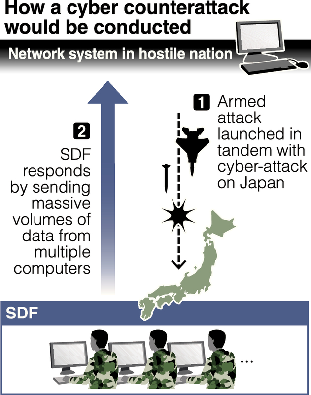 In many cases, a cyber-attack is conducted after taking over the server of a totally unrelated third party. Accordingly, determining that a cyber-attack by itself "was the exercise of force based on a state's will would be difficult," a senior Defense Ministry official said. Because of this, the SDF would be permitted to launch cyber counterattacks only when Japan had been targeted by a cyber-attack accompanied by an attack with conventional weapons. The government assumes such cases would involve a cyber-attack launched integrally with a ballistic missile attack or an invasion in which enemy forces come ashore on Japanese territory.