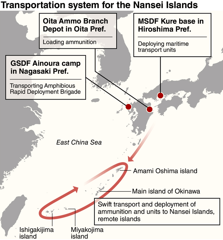 One emerging idea is that those ships would be operated by the joint maritime transport units and stationed at MSDF Kure base in Kure, Hiroshima Prefecture. In the event of a contingency on the Nansei Islands, the government is considering transporting ammunition from the Oita Ammo Branch Depot in Oita and personnel from the Amphibious Rapid Deployment Brigade at the GSDF's Ainoura camp in Sasebo, Nagasaki Prefecture, whose mission is to recapture the remote islands.