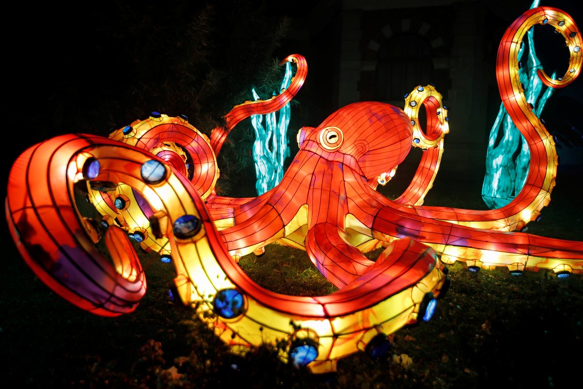 PARIS (Reuters) - Giant lanterns in the shape of killer whales, octopuses and clown fish were lit up on Friday in the middle of a four-centuries-old botanical garden in Paris.