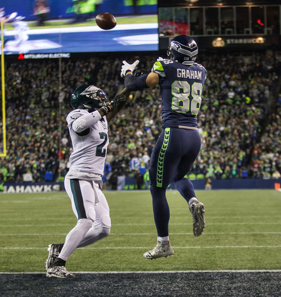 Later in the quarter the Seahawks moved 85 yards on five plays aided by consecutive Eagles' penalties for pass interference and holding to take a 10-0 lead on an 11-yard touchdown pass from Wilson to Jimmy Graham.