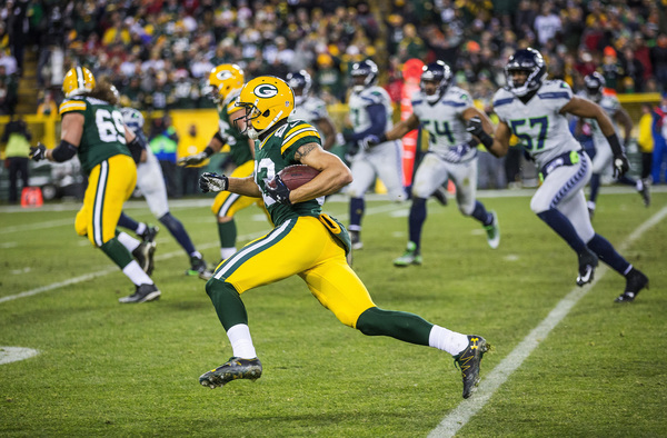 Nelson ran straight through what appeared to be a Seattle zone defense, and got behind everyone into the end zone to snag Rodgers' pass.