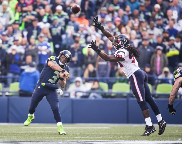 Seattle came right back to tie it on a 20-yard pass from Wilson to Richardson, which came two plays after the Seahawks had appeared stopped at the Houston 31. But what had been initially ruled as a Wilson incompletion was instead judged after replay to be a fumble forced when Wilson was hit by Jadeveon Clowney as he threw. Many players appeared to stop but Seattle Luke Willson fell on the ball at the 20 and that gave Seattle possession after it was ruled a fumble.