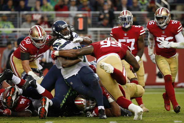 Seattle made it a priority to contain San Francisco running back Carlos Hyde _ who had 124 yards in the first game between the two teams, the most against the Seahawks this year. The Seahawks made good on that goal in the first half as Hyde had just 9 yards on eight carries.