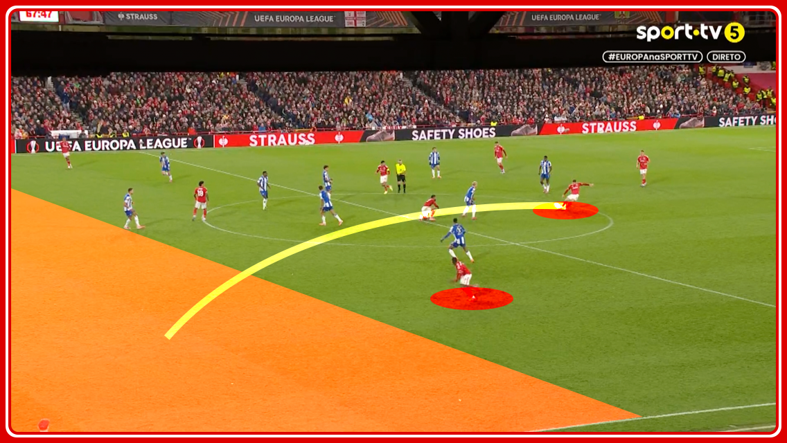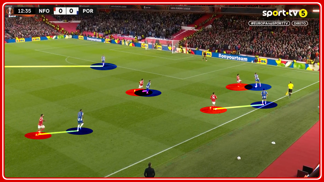 Like, this is their shape a few minutes before the goal: denying time, denying space, forcing Porto to go long into areas where Forest could aggressively challenge in the air or contest second balls.