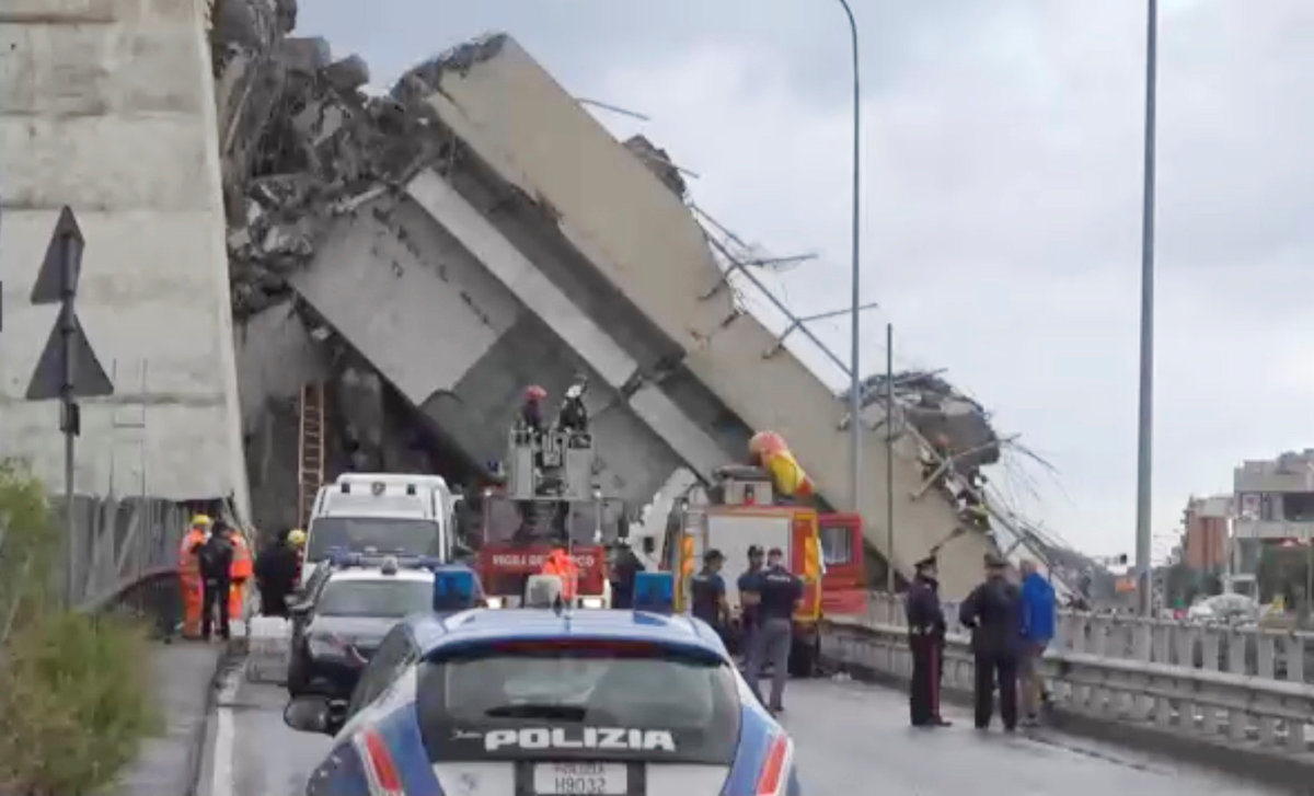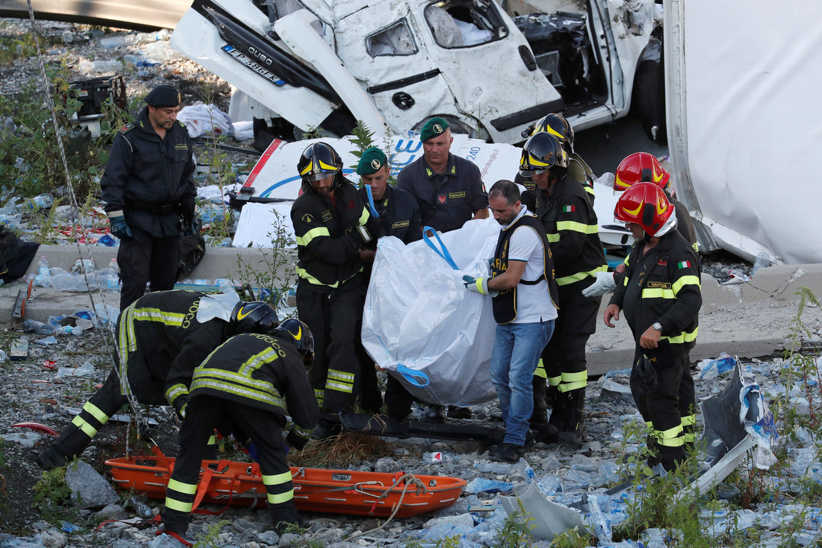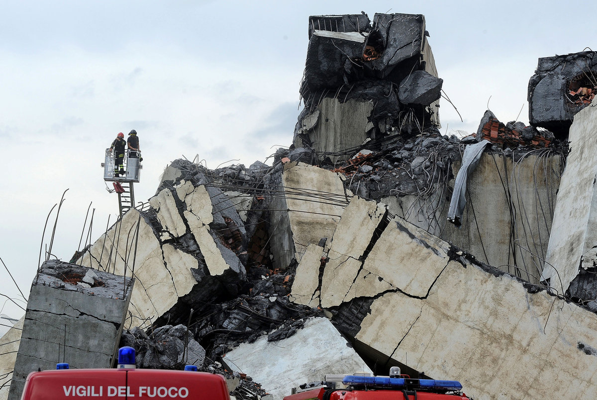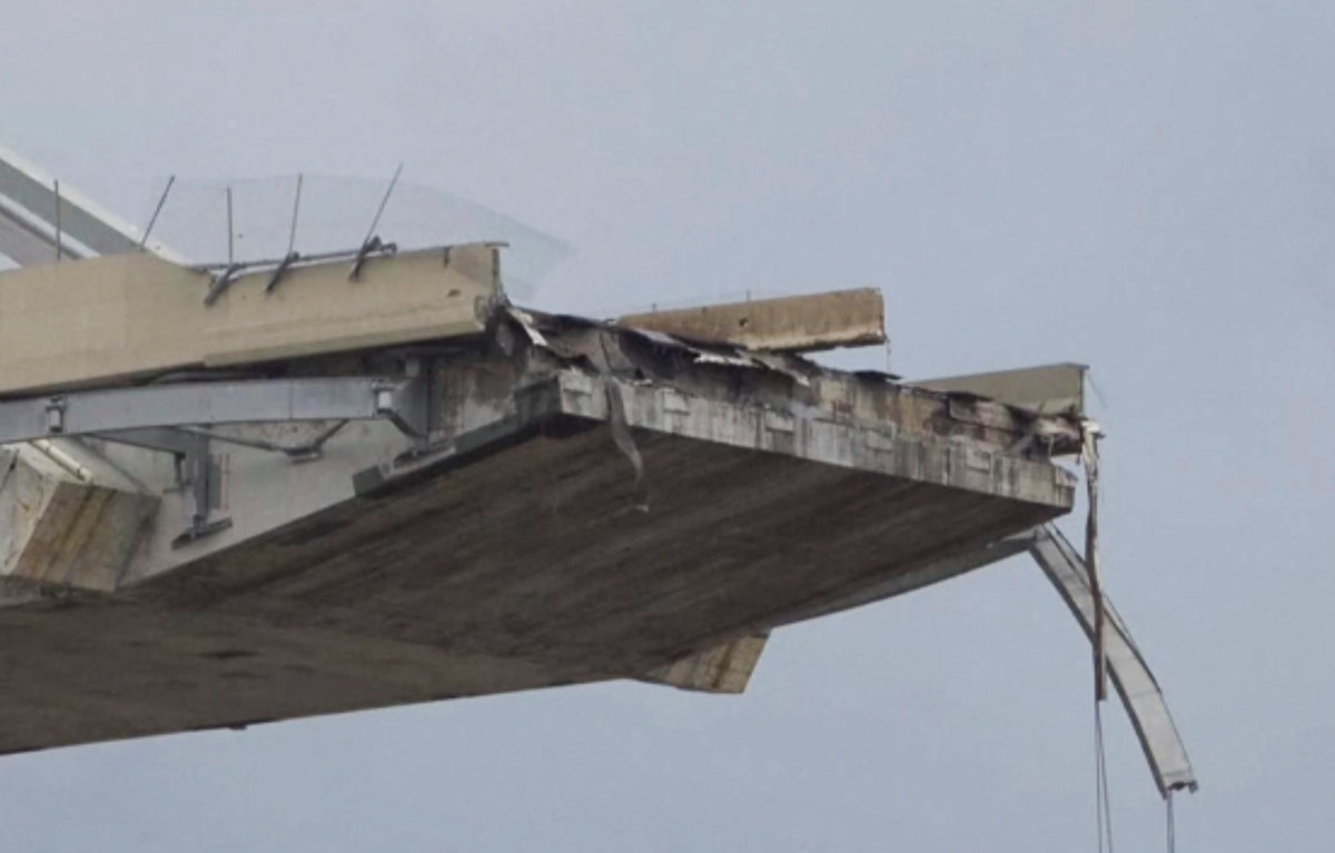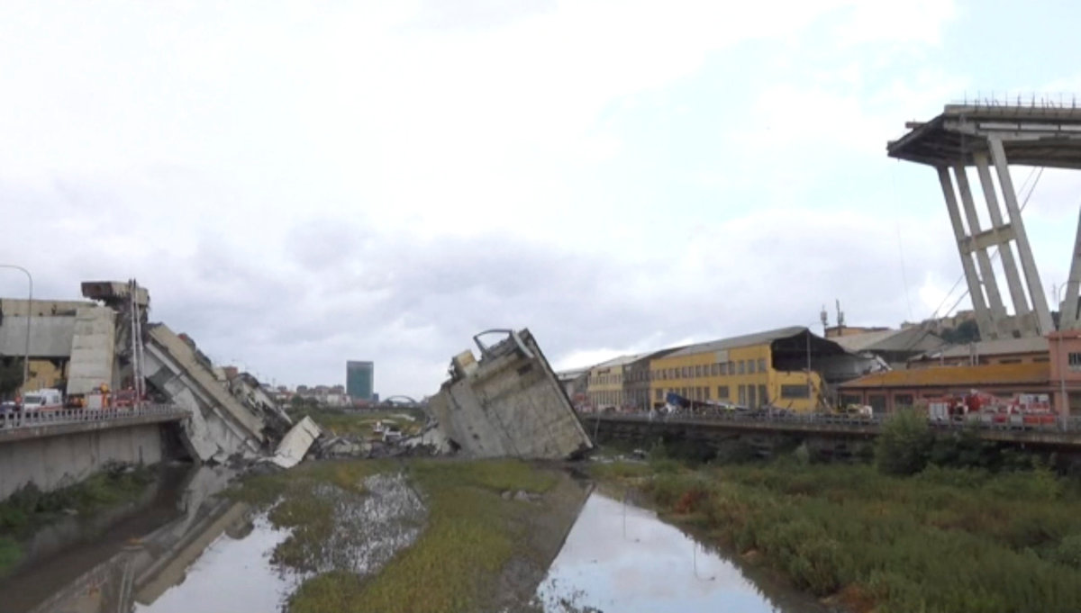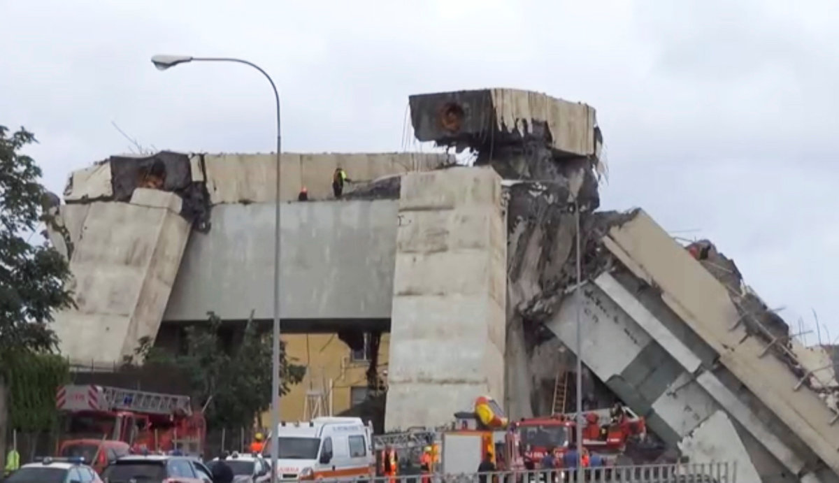 Rescue workers are seen at the collapsed Morandi Bridge in the Italian port city of Genoa, Italy August 14, 2018. REUTERS/Stefano RellandiniRescue workers are seen at the collapsed Morandi Bridge in the Italian port city of Genoa, Italy August 14, 2018. REUTERS/StringerRescue workers are seen at the collapsed Morandi Bridge in the Italian port city of Genoa, Italy, August 14, 2018. Local Team via Reuters TV/REUTERSThe collapsed Morandi Bridge is seen in the Italian port city of Genoa. Italian Firefighters Press Office/Handout via REUTERSA rescue helicopter flies over the collapsed Morandi Bridge in the Italian port city of Genoa, Italy August 14, 2018. REUTERS/Stefano RellandiniThe collapsed Morandi Bridge is seen in the Italian port city of Genoa, Italy August 14, 2018. REUTERS/Stefano RellandiniThe collapsed Morandi Bridge is seen in the Italian port city of Genoa, Italy August 14, 2018. REUTERS/Stefano RellandiniThe collapsed Morandi Bridge is seen in the Italian port city of Genoa, Italy August 14, 2018. REUTERS/Stefano RellandiniThe collapsed Morandi Bridge is seen in the Italian port city of Genoa, Italy August 14, 2018. REUTERS/Stefano RellandiniThe collapsed Morandi Bridge is seen in the Italian port city of Genoa, Italy, August 14, 2018. Local Team via Reuters TV/REUTERSRescue workers are seen at the collapsed Morandi Bridge in the Italian port city of Genoa, Italy August 14, 2018 in this still image taken from a video. Local Team via Reuters TV/REUTERSRescue workers are seen at the collapsed Morandi Bridge in the Italian port city of Genoa, Italy August 14, 2018 in this still image taken from a video. Local Team via Reuters TV/REUTERSRescue workers are seen at the collapsed Morandi Bridge in the Italian port city of Genoa, Italy, August 14, 2018. Local Team via Reuters TV/REUTERSThe collapsed Morandi Bridge is seen in the Italian port city of Genoa in this picture released by Italian firefighters on August 14, 2018. Italian Firefighters Press Office/Handout via REUTERSRescue workers are seen at the collapsed Morandi Bridge in the Italian port city of Genoa, Italy August 14, 2018 in this still image taken from a video. Local Team via Reuters TV/REUTERSThe collapsed Morandi Bridge is seen in the Italian port city of Genoa, Italy, August 14, 2018. Local Team via Reuters TV/REUTERSRescue workers are seen at the collapsed Morandi Bridge in the Italian port city of Genoa, Italy August 14, 2018 in this still image taken from a video. Local Team via Reuters TV/REUTERSRescue workers are seen at the collapsed Morandi Bridge in the Italian port city of Genoa, Italy August 14, 2018 in this still image taken from a video. Local Team via Reuters TV/REUTERSRescue workers are seen at the collapsed Morandi Bridge in the Italian port city of Genoa, Italy August 14, 2018 in this still image taken from a video. Local Team via Reuters TV/REUTERSRescue workers are seen at the collapsed Morandi Bridge in the Italian port city of Genoa, Italy August 14, 2018 in this still image taken from a video. Local Team via Reuters TV/REUTERSRescue workers are seen at the collapsed Morandi Bridge in the Italian port city of Genoa, Italy August 14, 2018 in this still image taken from a video. Local Team via Reuters TV/REUTERSRescue workers are seen at the collapsed Morandi Bridge in the Italian port city of Genoa, Italy August 14, 2018 in this still image taken from a video. Local Team via Reuters TV/REUTERSThe collapsed Morandi Bridge is seen in the Italian port city of Genoa in this picture released by Italian firefighters on August 14, 2018. Italian Firefighters Press Office/Handout via REUTERSThe collapsed Morandi Bridge is seen in the Italian port city of Genoa in this picture released by Italian firefighters on August 14, 2018. Italian Firefighters Press Office/Handout via REUTERS