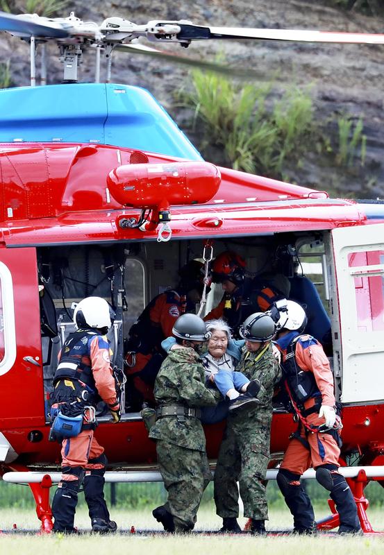 An elderly person is rescued from a community that was isolated by flooding in the Kuma River and transported by helicopter in Kuma, Kumamoto Prefecture, on Friday morning.