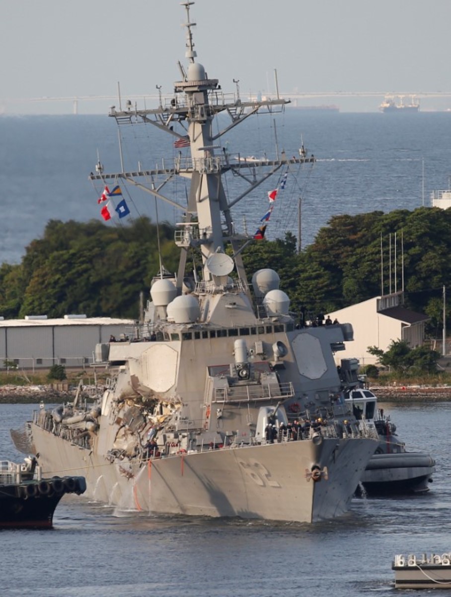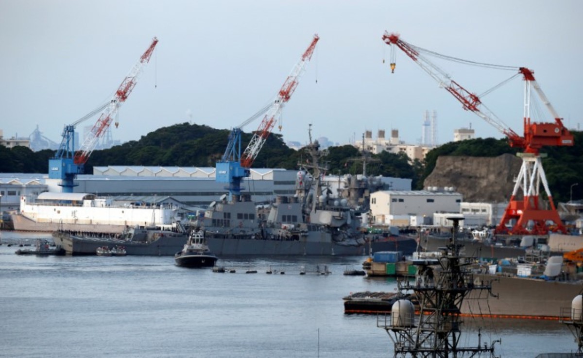 The Arleigh Burke-class guided-missile destroyer USS Fitzgerald, damaged by colliding with a Philippine-flagged merchant vessel, is towed by tugboats upon its arrival at the U.S. naval base in Yokosuka, south of Tokyo, Japan June 17, 2017. REUTERS/Toru HanaiThe Arleigh Burke-class guided-missile destroyer USS Fitzgerald, damaged by colliding with a Philippine-flagged merchant vessel, is towed by a tugboat upon its arrival at the U.S. naval base in Yokosuka, south of Tokyo, Japan June 17, 2017. REUTERS/Toru HanaiThe Arleigh Burke-class guided-missile destroyer USS Fitzgerald, damaged by colliding with a Philippine-flagged merchant vessel, is towed into the U.S. naval base in Yokosuka, south of Tokyo, Japan June 17, 2017. REUTERS/Toru HanaiAn injured crew member of the Arleigh Burke-class guided-missile destroyer USS Fitzgerald, damaged after colliding with a Philippine-flagged merchant vessel, is carried on a stretcher after arriving at the U. S. naval base in Yokosuka, south of Tokyo, Japan June 17, 2017. Japan Maritime Self-Defense Force/Handout via REUTERSThe sun sets after the Arleigh Burke-class guided-missile destroyer USS Fitzgerald (not pictured), damaged by colliding with a Philippine-flagged merchant vessel, has been towed into the U.S. naval base, as the Japanese Maritime Self-Defence Force (JMSDF) naval escort vessel Yamagiri is seen in front, in Yokosuka, south of Tokyo, Japan June 17, 2017. REUTERS/Toru Hanai