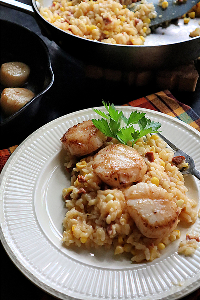 SEARED SCALLOPS WITH CORN AND CHORIZO RISOTTO
