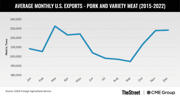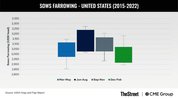 Lean Hogs and Pork Cutout are tightly correlated, though seasonal influences and differing market conditions dictate that the spread between the two varies throughout the year. The most active season for sows farrowing is June to August, according to the USDA quarterly Hogs and Pigs Report. The pigs that are born over those summer months are then market-ready by the early winter months, leading to seasonally higher hog supplies toward the end of the year.