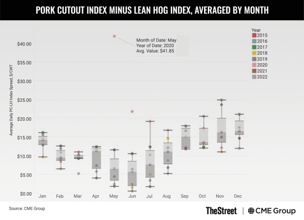 The chart below shows the difference between the Pork Cutout and the Lean Hogs Indices averaged and grouped by month, across the period from September 2015 to July 2022. The spread represents the value of processed pork relative to unprocessed hogs: the median spread is highest in November and December and lowest in the summer months. As a result of seasonal trends in farrowing, there is an abundant supply of lean hogs in the market in November and December relative to the rest of the year. This tends to drive the price down. At the same time, there are various factors that can lend strength to pork cutout prices, such as holiday demand for hams, which can ultimately lead to a higher cutout price relative to hogs.