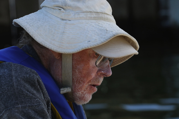 Ewing is still at the helm, eating an apple, waiting for passengers for his afternoon sail.