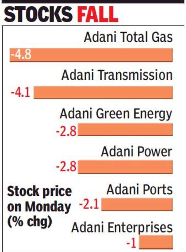 On Monday, shares of Adani group companies — Adani Total Gas, Adani Power, Adani Transmission, Adani Ports & Special Economic Zone, Adani Green Energy and Adani Enterprises — took a beating, closing between 1% and 4.8% lower.