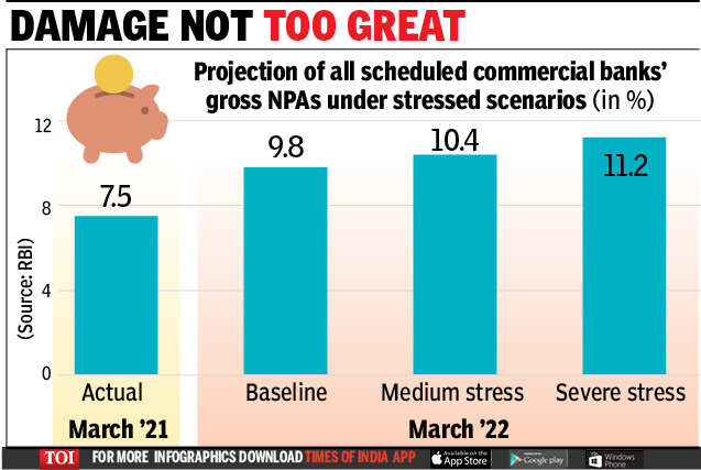 According to the stress tests conducted by the RBI, the banking sector’s bad loans or gross non-performing assets (GNPAs) may increase from 7.48% in March 2021 to 9.8% by March 2022 under the baseline scenario, and to 11.22% under a severe stress scenario. In January, the RBI had said that GNPAs in September 2021 would be around 13.5% under the baseline scenario and 14.8% under a severe stress situation.