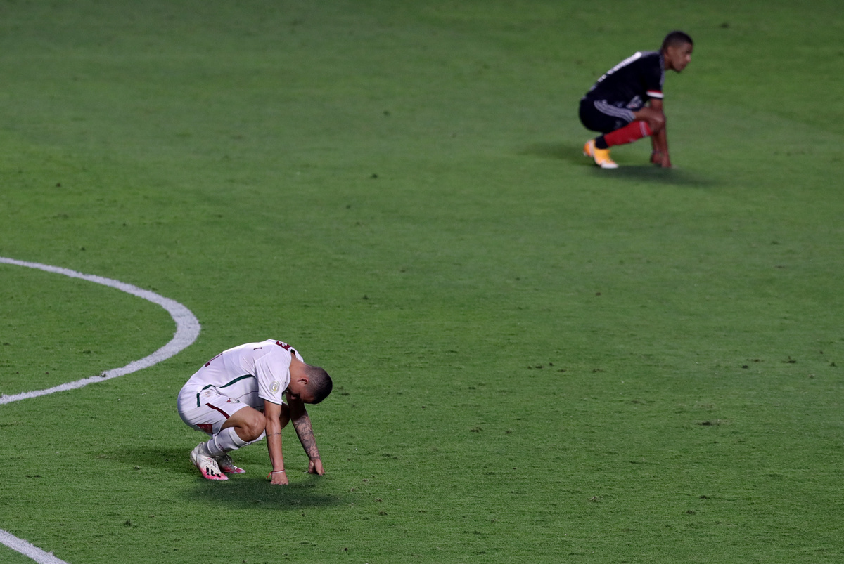 Soccer Football - Brasileiro Championship - Sao Paulo v Fluminense - Morumbi Stadium, Sao Paulo, Brazil - September 6, 2020 Fluminense's Wellington Silva celebrates scoring their first goal, following the resumption of play behind closed doors after the outbreak of the coronavirus disease (COVID-19) REUTERS/Amanda PerobelliSoccer Football - Brasileiro Championship - Sao Paulo v Fluminense - Morumbi Stadium, Sao Paulo, Brazil - September 6, 2020 Fluminense's Calegari looks dejected after the match, following the resumption of play behind closed doors after the outbreak of the coronavirus disease (COVID-19) REUTERS/Amanda Perobelli