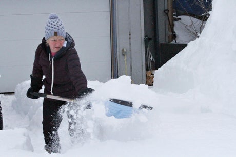 She was taking care of the first layer of snow because it was too tall for their snowblower, being operated by her husband, Dirk.