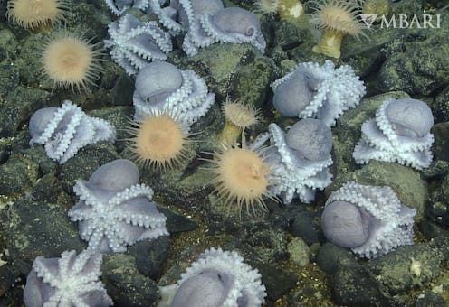To solve this mystery, we assembled geologists, biologists and engineers. Using Monterey Bay Aquarium Research Institute’s deep-sea robots and sensors, we studied and mapped the Octopus Garden during several visits over three years to examine the links between thermal springs and breeding success for pearl octopuses. We found nearly 6,000 nests in a 6-acre (2.5-hectare) area, suggesting more than 20,000 octopuses occupy this site.