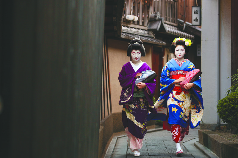 KYOTO -- Their black hair done up with colorful, delicately crafted hairpins, their faces painted white and their luxurious kimono like works of art, maiko apprentice geiko are often described as walking museums. The only place to catch a glimpse of these dazzling creatures is in Kyoto.