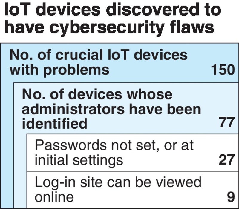 An Internal Affairs and Communications Ministry survey has found evidence of 150 cases of cybersecurity flaws in devices that are linked to the internet of things, or IoT (see below), and are used to remotely monitor the country's crucial infrastructure such as dams and railways.