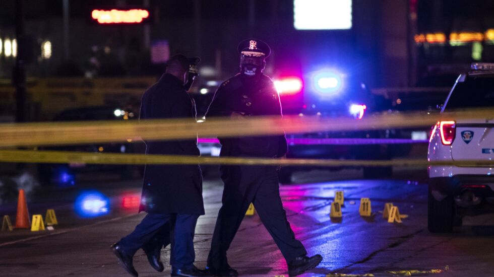 The guard was shot while intervening as two men, 21 and 23, exchanged gunfire with another man, 19, in the 1000 block of West 14th Street about 10:50 p.m., Chicago police said.