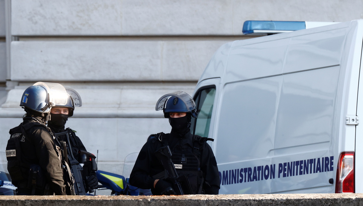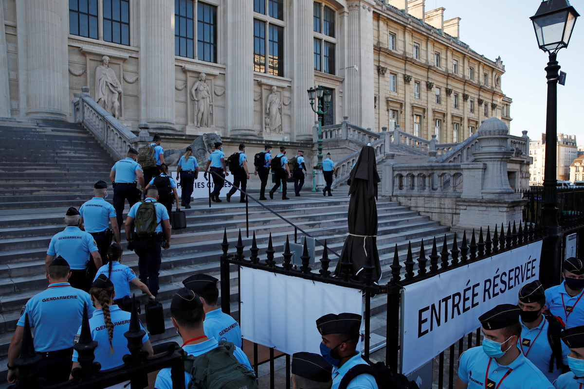 Police mounted tight security around the Palais de Justice courthouse in central Paris. Defendants appeared behind a reinforced glass partition in a purpose-built courtroom and all people must pass through several checkpoints to enter the court.