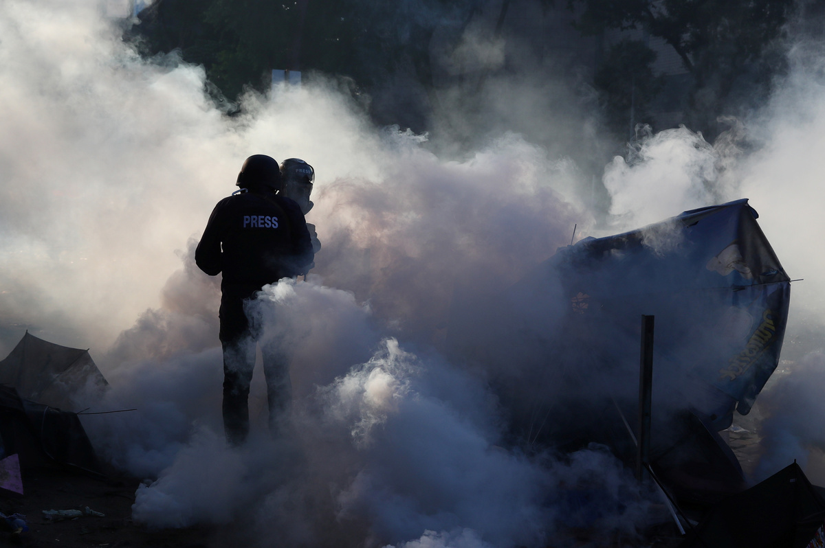 Many protesters wore gas masks or tied handkerchiefs over their mouths and noses to protect themselves from clouds of tear gas. Some stripped down to their underwear, after earlier dousings from water cannon that witnesses said contained an irritant.