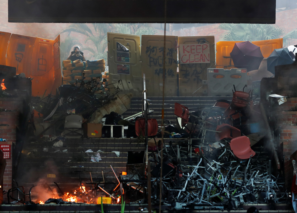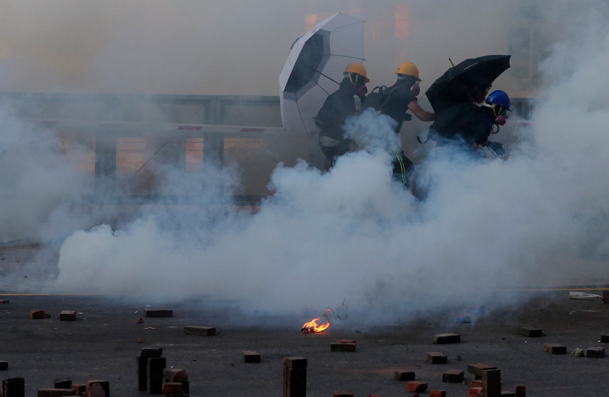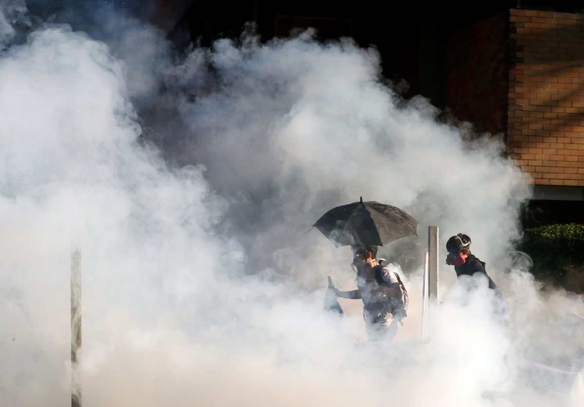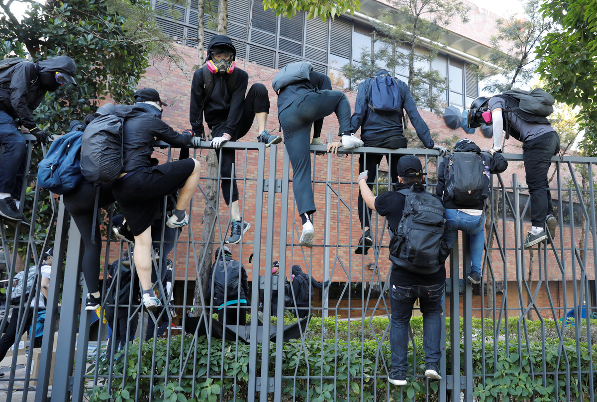 HONG KONG (Reuters) - Hong Kong police fired tear gas at protesters as they tried to escape a besieged university on Monday while hundreds more pro-democracy activists stayed inside armed with petrol bombs and other weapons awaiting an expected operation to oust them.