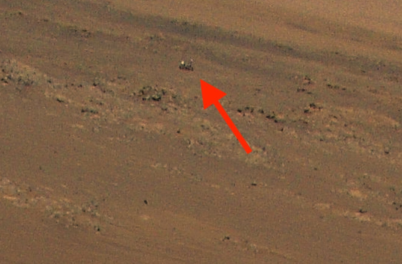 Start by looking for Ingenuity’s shadow at the bottom of the photo, just right of center. If you follow the line from the shadow straight up to the top of the photo and look slightly further right in the rocky dune field, you’ll see a white speck. That’s no rock.