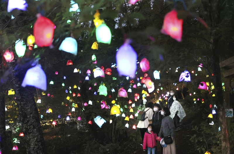 Fruit protection bags containing LED bulbs instead of fruit are hung from trees to illuminate the Rokko Forest Sound Museum in Kobe on Sunday. Part of the Night Museum event during the Rokko Meets Art 2021 festival, which runs through Nov. 23 at various venues, the fanciful atmosphere was created by Kyota Takahashi. The artist used about 3,000 bags usually for protecting apples and pears for the multicolor installation, which will be lit up on weekends this month, and everyday in November.
