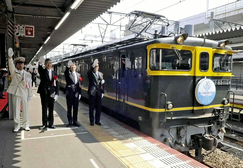 A train to commemorate the 30th anniversary of the Seto Ohashi bridge, which links the major islands of Honshu and Shikoku across the Seto Inland Sea, gets ready to depart from JR Okayama Station as Okayama Gov. Ryuta Ibaragi, second from right, and others signal its departure on Tuesday morning. The special six-car train bound for Matsuyama Station in Matsuyama features an observation carriage and a commemorative plate marking the bridge's 30th anniversary. About 100 passengers participated in a two-day train journey exclusively offered for the occasion.