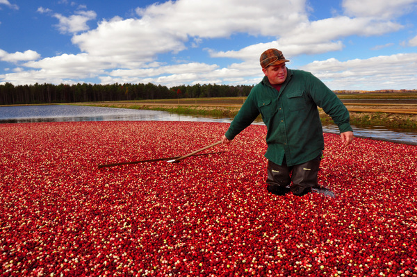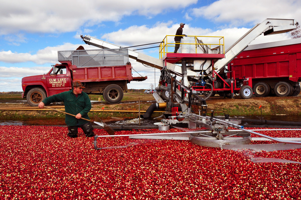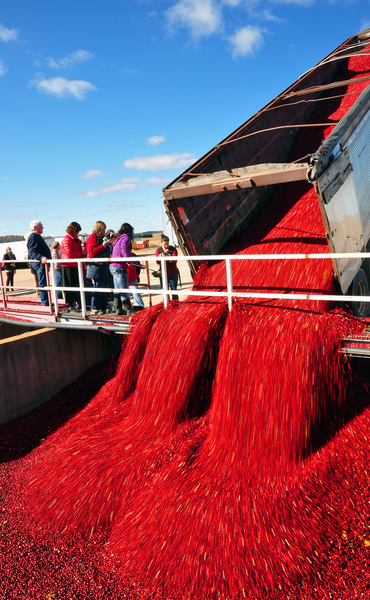 During that short window of time, usually late September through mid-October, visitors head for central and northern Wisconsin to watch machines comb through vines and workers in hip waders corral the just-plucked crimson fruit onto conveyer belts.