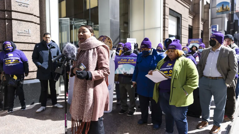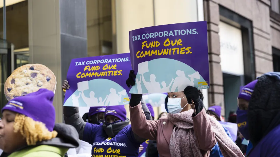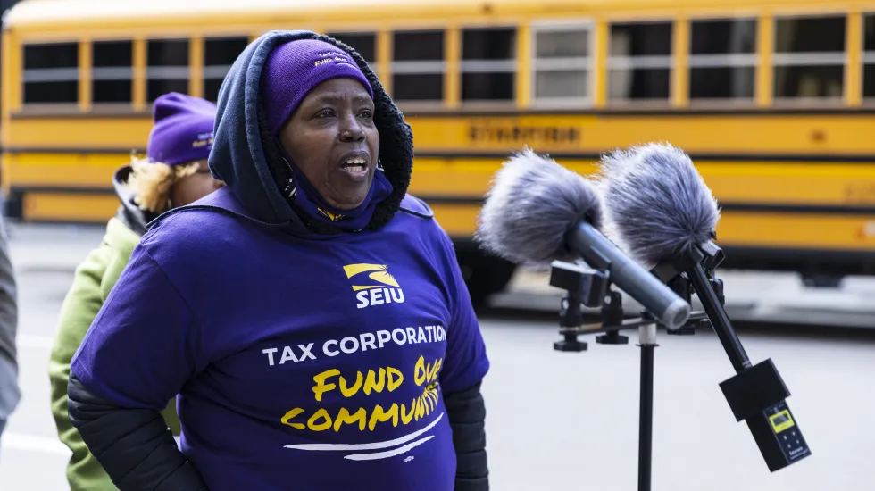 Members of the Service Employees International Union chanted “pay your fair share” alongside local elected leaders at a rally in downtown Chicago Thursday, urging companies to pay more in taxes.