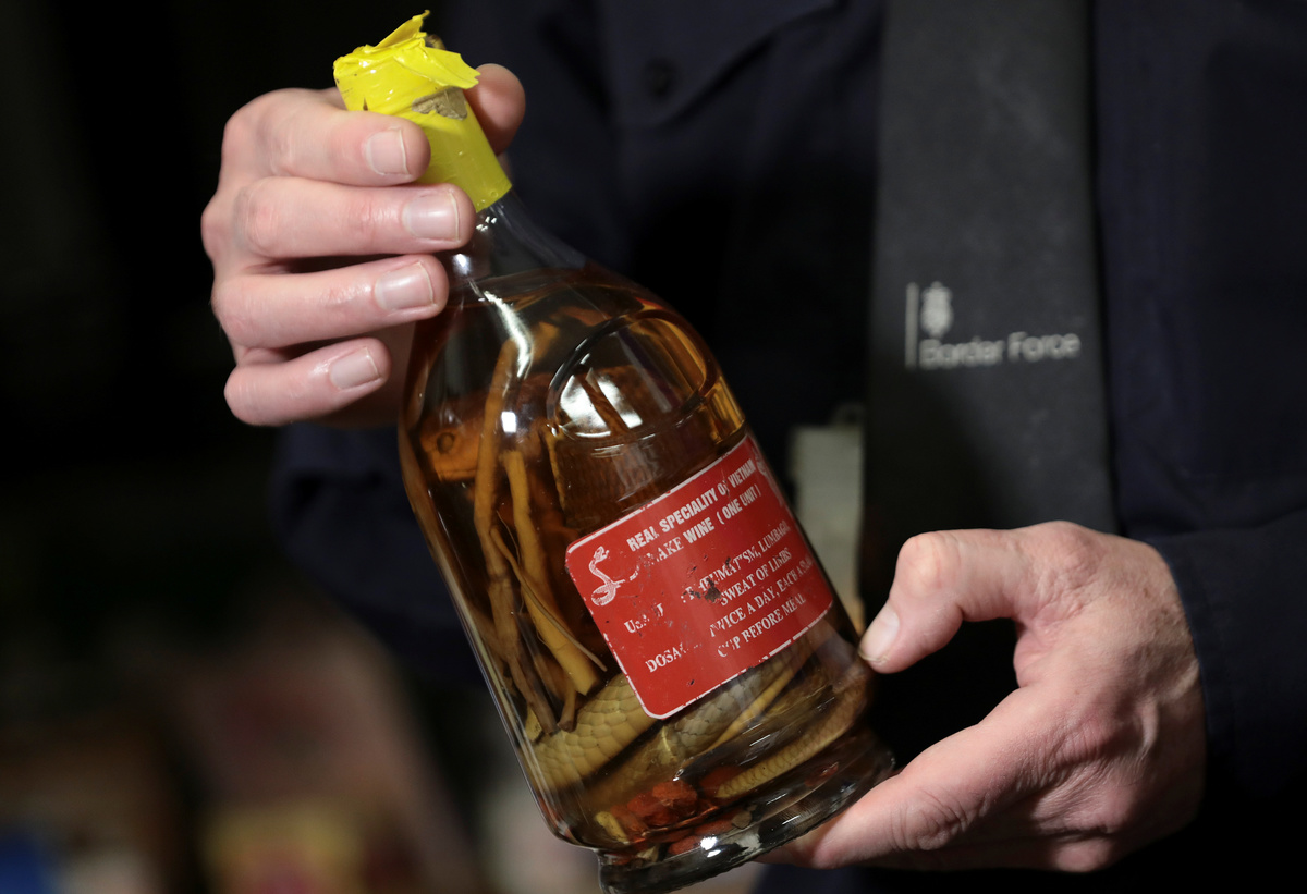 In the evidence lock-up near Britain's Heathrow Airport, home to a menagerie of confiscated wildlife contraband, UK Border Force investigator Jan Sowa picks up a tonic bottle from Asia, containing an entire snake.