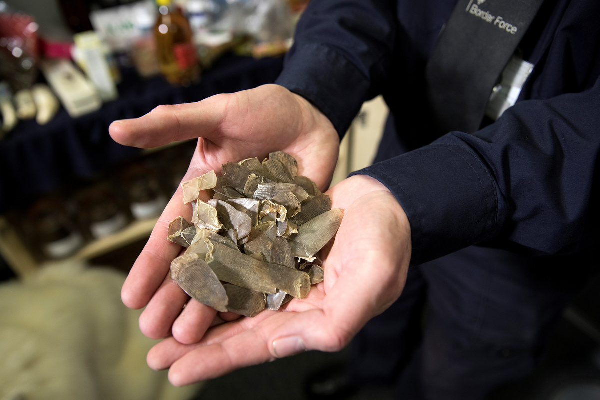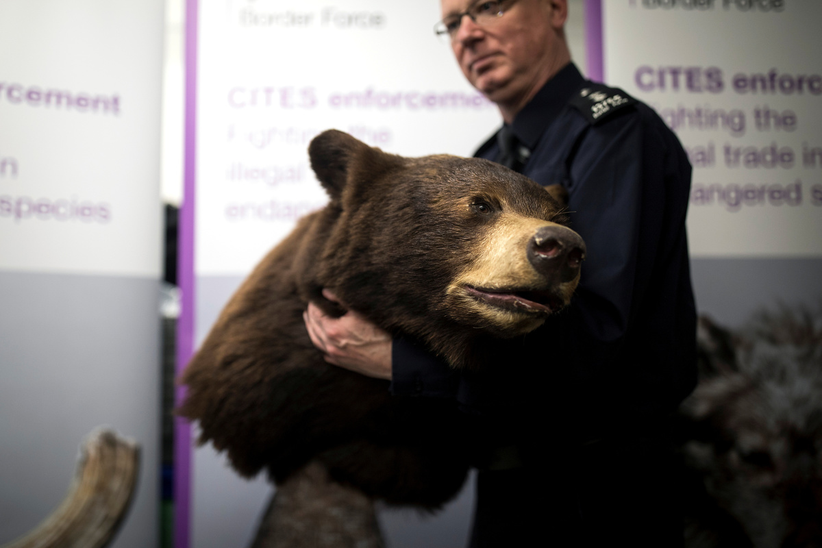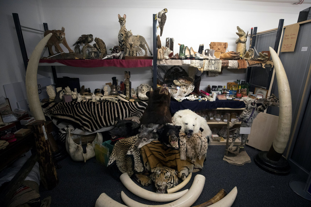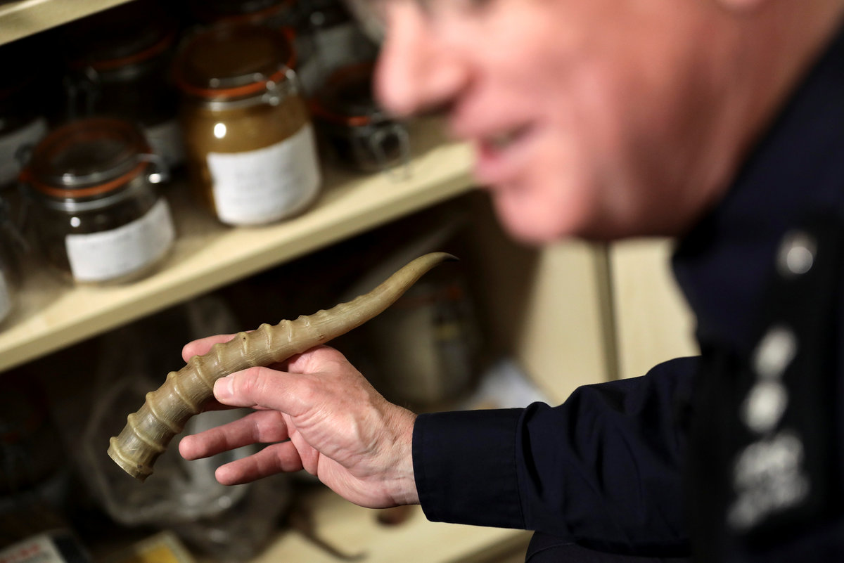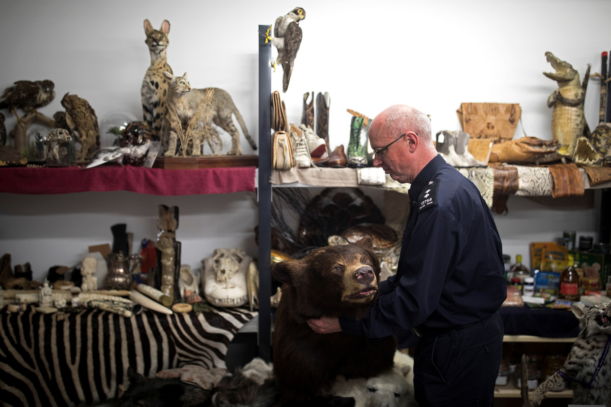 Taxidermy endangered species seized by UK Border Force officers at Heathrow Airport sit on display at Custom House near Heathrow in London, Britain November 22, 2017. REUTERS/Simon DawsonA border force officer moves a Taxidermy brown bear seized by UK Border Force officers at Heathrow Airport as they sit on display at Custom House near Heathrow in London, Britain November 22, 2017. REUTERS/Simon DawsonAn officer holds a package containing bear bile seized by UK Border Force at Heathrow Airport near Custom House near Heathrow in London, Britain November 22, 2017. REUTERS/Simon DawsonA UK Border Force officers identification number sits on the shoulder of an officer at Custom House near Heathrow in London, Britain November 22, 2017. REUTERS/Simon DawsonAn officer shows a jar of dried seahorse, seized by the UK Border Force at Heathrow Airport at Custom House near Heathrow in London, Britain November 22, 2017. REUTERS/Simon DawsonAn officer shows off Pangolin scales seized by the UK Border Force at Heathrow Airport at Custom House near Heathrow in London, Britain November 22, 2017. REUTERS/Simon DawsonSnake skin boots seized by the U.K. Border Force at Heathrow Airport sit on display at Custom House near Heathrow in London, Britain November 22, 2017. REUTERS/Simon DawsonSnake skin boots seized by UK Border Force officers at Heathrow Airport sit on display at Custom House near Heathrow in London, Britain November 22, 2017. REUTERS/Simon DawsonCrocodile taxidermy seized by UK Border Force officers at Heathrow Airport sit on display at Custom House near Heathrow in London, Britain November 22, 2017. REUTERS/Simon DawsonTaxidermy endangered species seized by UK Border Force officers at Heathrow Airport sit on display at Custom House near Heathrow in London, Britain November 22, 2017. REUTERS/Simon DawsonA officer holds a package containing crushed tiger bones, seized by the UK Border Force at Heathrow Airport at Custom House near Heathrow in London, Britain November 22, 2017. REUTERS/Simon DawsonAn officer holds a package containing Red Ant viagra seized by UK Border Force at Heathrow Airport at Custom House near Heathrow in London, Britain November 22, 2017. REUTERS/Simon DawsonAn officer holds a container of 'Craze' a body building supplement, seized by the UK Border Force at Heathrow Airport at Custom House near Heathrow in London, Britain November 22, 2017. REUTERS/Simon DawsonIvory carvings seized by the UK Border Force at Heathrow Airport sit on display at Custom House near Heathrow in London, Britain November 22, 2017. REUTERS/Simon DawsonAn officer holds a bottle of cobra tonic seized by the UK Border Force at Heathrow Airport at Custom House near Heathrow in London, Britain November 22, 2017. REUTERS/Simon DawsonAn officer shows off a jar of Hoodia, used as a appetite suppressant, seized by the UK Border Force at Heathrow Airport at Custom House near Heathrow in London, Britain November 22, 2017. REUTERS/Simon DawsonTaxidermy of endangered species seized by UK Border Force officers at Heathrow Airport sit on display at Custom House near Heathrow in London, Britain November 22, 2017. REUTERS/Simon Dawson