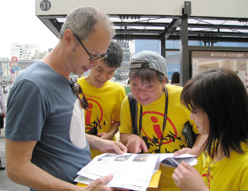 On a sweltering weekend in mid-July, volunteers wearing matching yellow T-shirts walked around Shinjuku Station in Tokyo looking for foreign travelers who seemingly might be having some trouble.