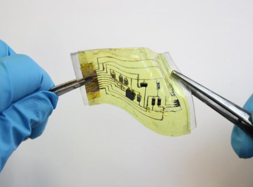 The thin and flexible circuit boards are self-healing and can be worn on any part of the body to track metrics like heart beat and step counts.