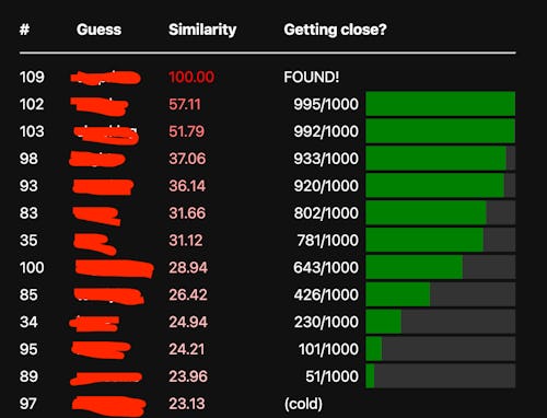 For example: Today’s ranking of my 109 guesses from the winning word (“surprise”) to its least related inputs saw attempts like “electrifying” and “frightful” ranked below “huge,” “big,” and “horror.” To some (and the game itself) that makes sense, but to other players that may seem illogical. But that’s part of the beauty of this whole project, isn’t it?