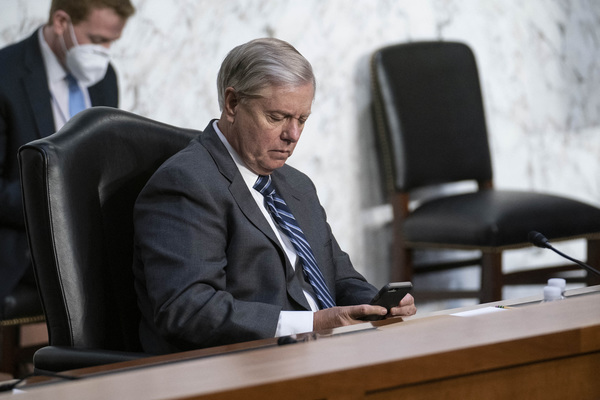 Sen. Lindsey Graham, R-S.C. and chairman of the Senate Judiciary Committee, uses his cell phone on the third day of the Senate Judiciary Committee confirmation hearing for Supreme Court nominee Judge Amy Coney Barrett on Capitol Hill on Wednesday, Oct. 14, 2020 in Washington, D.C. (Sarah Silbiger/Pool/Abaca Press/TNS)
