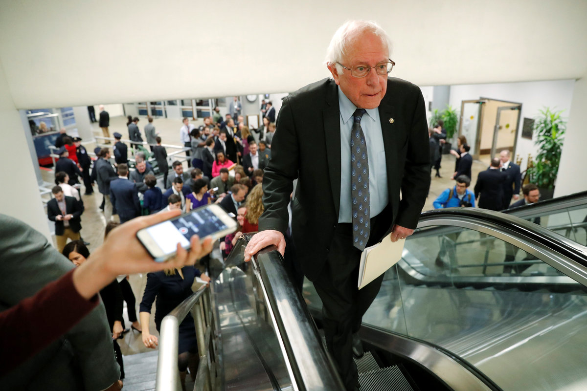 Reporters trail U.S. Senator Bernie Sanders (I-VT) as he arrives ahead of a vote on a bill to renew the National Security Agency's warrantless internet surveillance program, at the U.S. Capitol in Washington, U.S. January 18, 2018. REUTERS/Jonathan Ernst