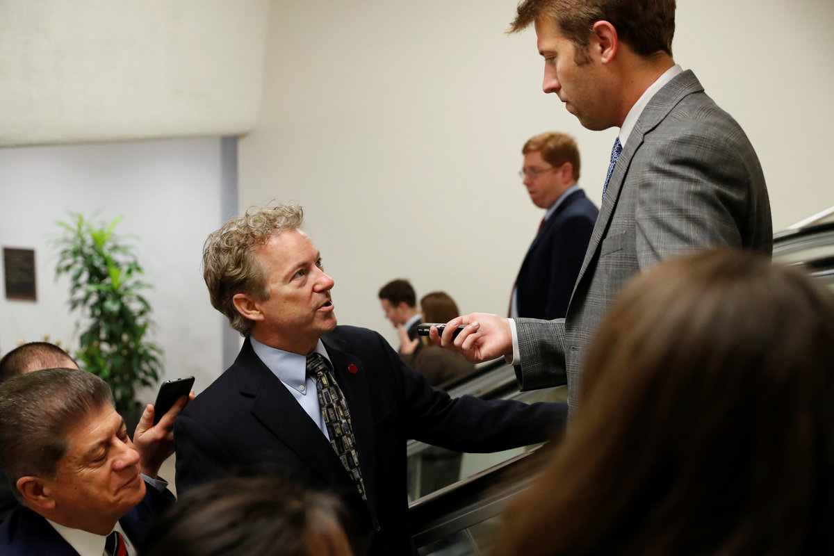 Reporters trail U.S. Senator Rand Paul (R-KY) as she arrives ahead of a vote on a bill to renew the National Security Agency's warrantless internet surveillance program, at the U.S. Capitol in Washington, U.S. January 18, 2018. REUTERS/Jonathan Ernst