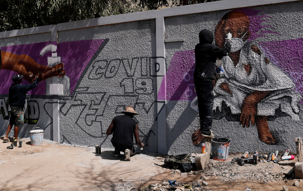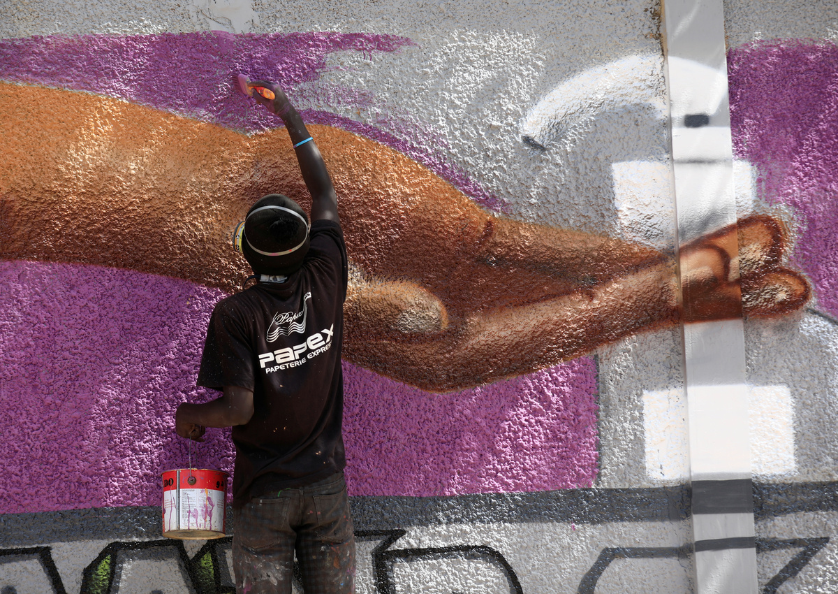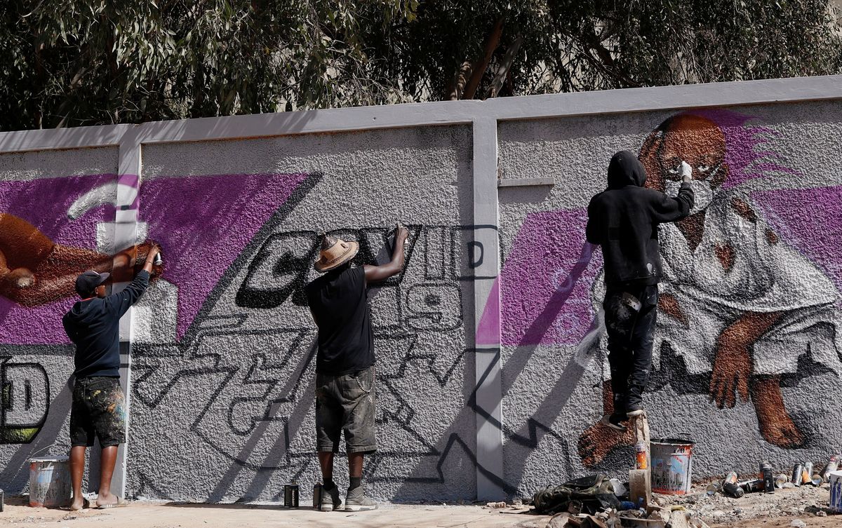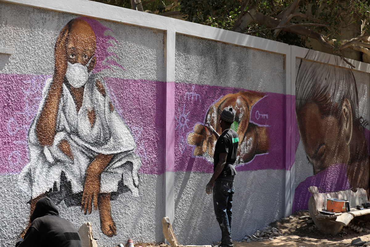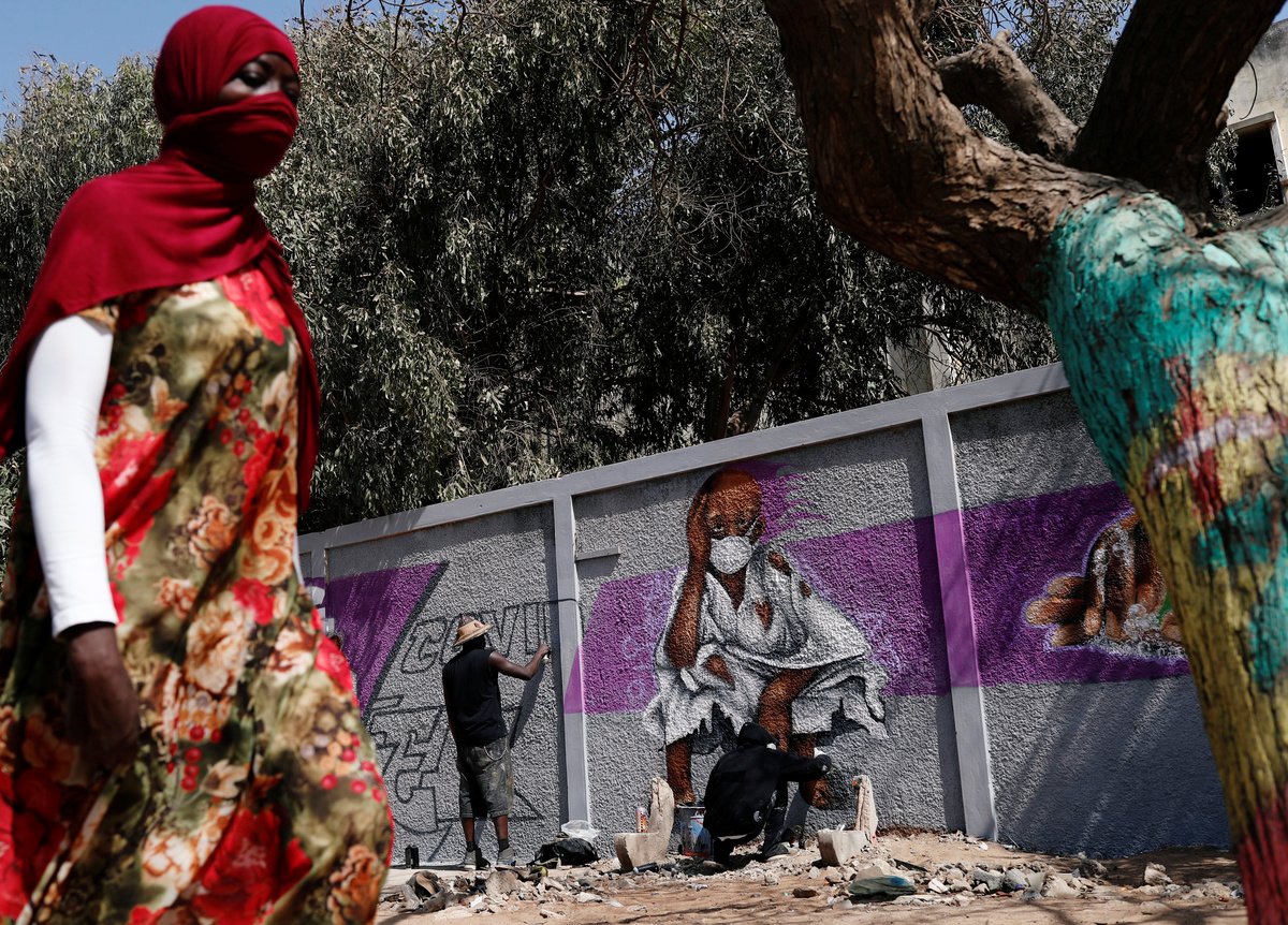 Graffiti artists from RBS crew work on their mural to encourage people to protect themselves amid the outbreak of the coronavirus disease (COVID-19), in Dakar, Senegal March 25, 2020. Picture taken March 25, 2020. REUTERS/Zohra BensemraA man, wearing a face mask, walks past graffiti artists from RBS crew as they work on their mural to encourage people to protect themselves amid the outbreak of the coronavirus disease (COVID-19), in Dakar, Senegal March 25, 2020. Picture taken March 25, 2020. REUTERS/Zohra BensemraGraffiti artists from RBS crew work on their mural to encourage people to protect themselves amid the outbreak of the coronavirus disease (COVID-19), in Dakar, Senegal March 25, 2020. Picture taken March 25, 2020. REUTERS/Zohra BensemraGraffiti artists from RBS crew work on their mural to encourage people to protect themselves amid the outbreak of the coronavirus disease (COVID-19), in Dakar, Senegal March 25, 2020. Picture taken March 25, 2020. REUTERS/Zohra BensemraGraffiti artists from RBS crew work on their mural to encourage people to protect themselves amid the outbreak of the coronavirus disease (COVID-19), in Dakar, Senegal March 25, 2020. Picture taken March 25, 2020. REUTERS/Zohra Bensemra