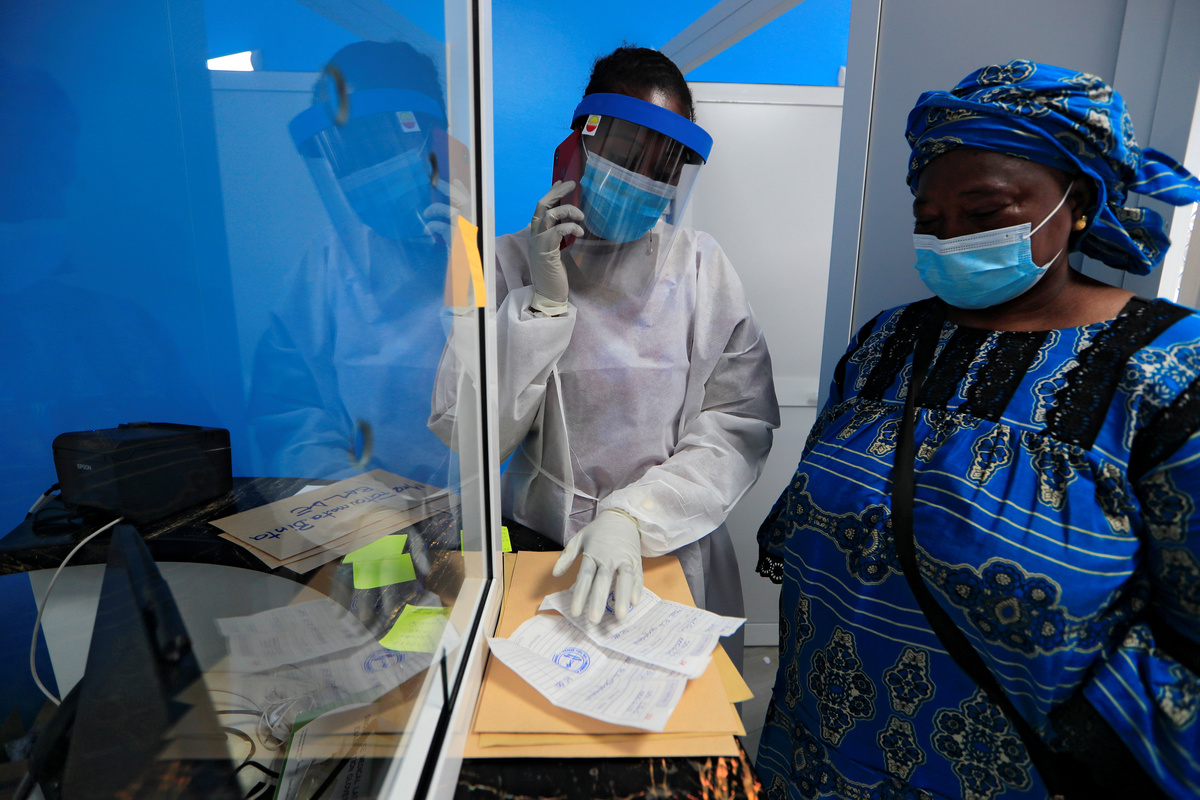 A healthcare worker wearing protective gear checks a document of a woman as she waits to be tested for the coronavirus disease (COVID-19) at an Institute for Health Research, Epidemiological Surveillance and Training (IRESSEF) testing center in Dakar, Senegal July 24, 2020. REUTERS/Zohra Bensemra