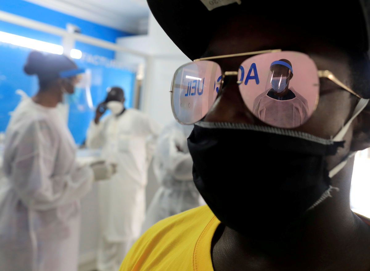 A man speaks with a healthcare worker at the reception desk before his test for the coronavirus disease (COVID-19) at an Institute for Health Research Epidemiological Surveillance and Training (IRESSEF) testing center, in Dakar, Senegal July 24, 2020. REUTERS/Zohra Bensemra