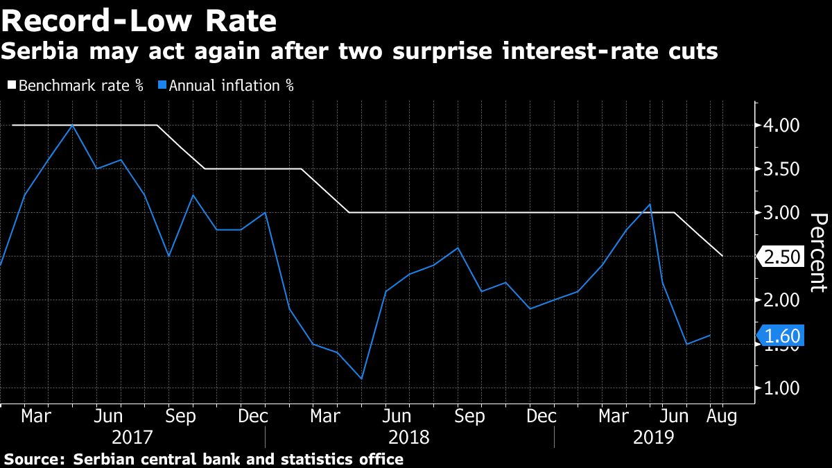 Europe’s most unpredictable central bank is leaving investors on tenterhooks again as they wonder if Serbia’s interest-rate decision augurs the third surprise cut in as many months.The prospect of two down and one to go would leave policy makers repeating a feat of confounding economists’ predictions last achieved in 2015, with three straight rate reductions. Last year they stopped after cutting twice.