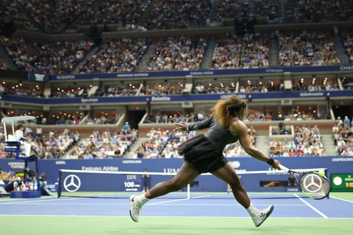 Sep 4, 2018; New York, NY, USA; Serena Williams of the United States hits a forehand against Karolina Pliskova of the Czech Republic (not pictured) in a quarter-final match on day nine of the 2018 U.S. Open tennis tournament at USTA Billie Jean King National Tennis Center. Mandatory Credit: Geoff Burke-USA TODAY Sports