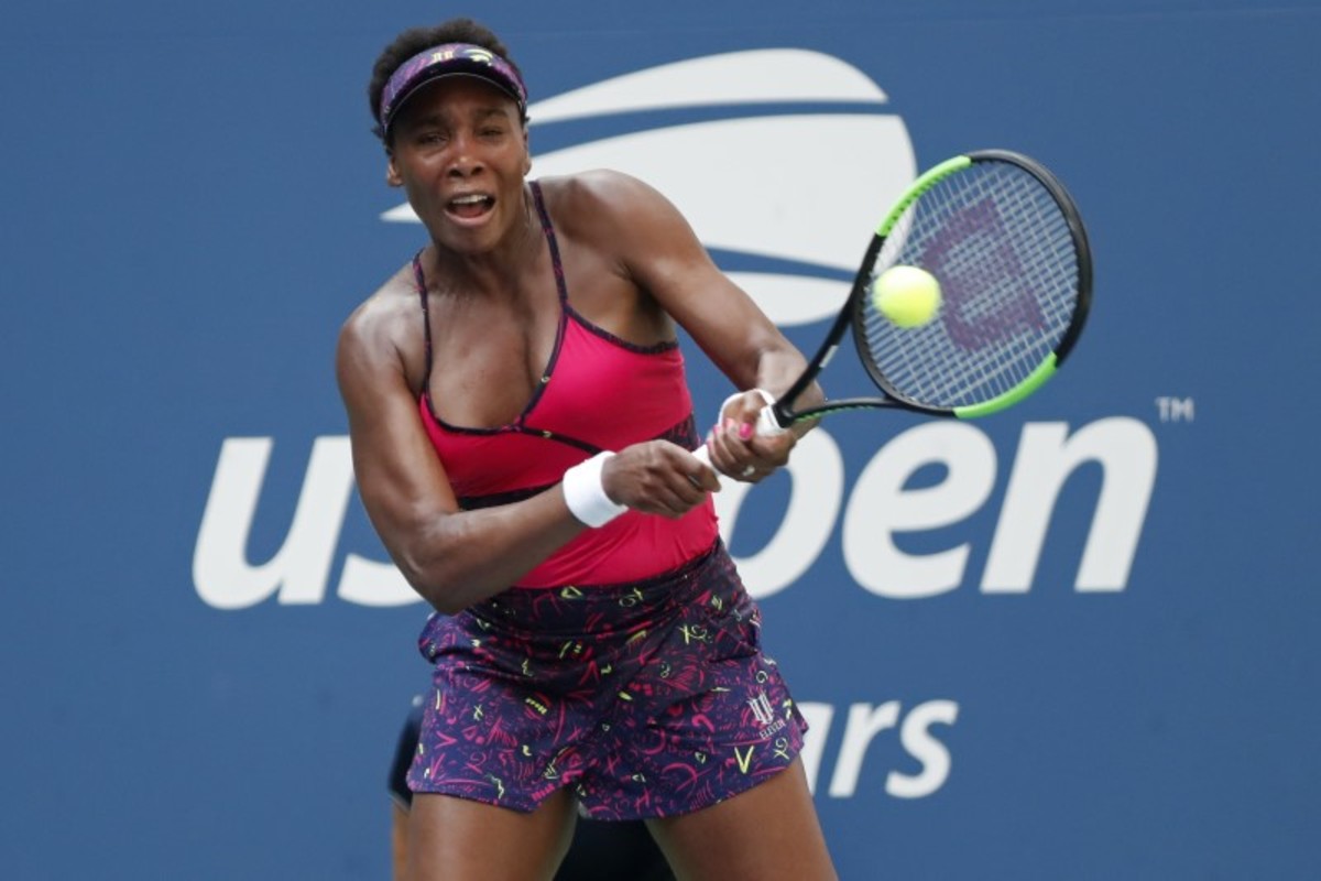 Aug 29, 2018; New York, NY, USA; Venus Williams of the United States hits a backhand against Camila Giorgi of Italy (not pictured) in the second round on day three of the 2018 U.S. Open tennis tournament at USTA Billie Jean King National Tennis Center. Mandatory Credit: Geoff Burke-USA TODAY Sports