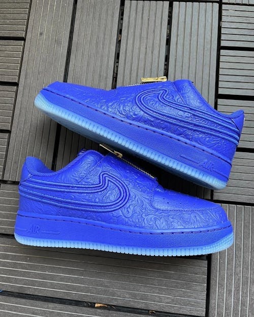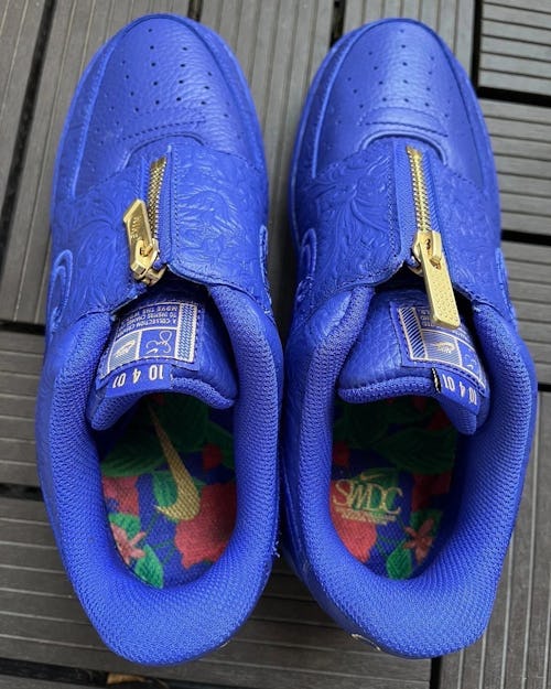 What stands out on the sneaker, aside from its bright blue dressing, is the immaculate detail on the upper. An elegant floral pattern is embossed into the leather exterior and texturized with protruding, double-stitched Nike Swooshes that loop around the heel. Her signature is embroidered in gold on the heel, and the insole provides an eye-catching contrast with multicolor florals. Similar to Williams’s previous Air Forces, the sneaker swaps a traditional lacing system for gold zippered flaps at the forefoot.